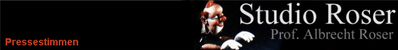 Fünfter Tag: Gustaf mit "f". Albrecht Roser ist der Fadenzieher seiner Solomarionetten und König aller Festivals. Seine Stücke sind virtuose und atmosphärische Kammerkunst. Auf kleiner offener Spielfläche beglückt und bezaubert er mit seinem Figurenensemble jedes Publikum...... das ist alles so fein, so lyrisch, so andächtig, wie es der schönste Theaterabend nur sein kann. Stuttgarter Zeitung ...Unter Verzicht auf alle Bühnen-Illusion erwachen diese Puppen wie durch Magie und lassen den Drahtzieher im Hintergrund spontan vergessen. Die Analyse der komplizierten Technik mit diagonalem Führungskreuz und den Horizontalbewegungen nur mittelbar auslösenden Pendel vermag die Seele in Rosers Puppenspiel so wenig zu ergründen, wie das Skalpell des Arztes die Seele des Menschen. Die Virtuosität ist für Albrecht Roser nur das Mittel zur Poesie... The Irish Press, Dublin Dublin saw its first puppet show "for adults only" - one of the most amazing unscheduled and unrehearsed sideshows ever - a fullhouse audience completely captivated by what can only be described as a "fantastic" (a word I never used before) performance. Daily Express, Manila Puppetry at its Apex. Information, Kopenhagen Etwas so Virtuoses und Suggestives habe ich nie gesehen, und ich habe auch nicht geglaubt, daß so etwas möglich ist. Tribune de Genève Prodigieux spectacle, parce que spectacle total: du théatre à l'état pur comme le rèvait Antonin Artaud. Un monde où tout est possible et où rien est défendu. Magie que cette technique au service de l'humour et de la sensibilité, de l'imagination et de la poésie. Le souffle du génie animait hier soir, cette petite salle. Albrecht Roser: Ein Meister aus Deutschland - ein Partner für das Goethe-Institut. Als Albrecht Roser, der Stuttgarter Weltbürger und Meister aus Schwaben, auf seinen vielen Wegstationen auch nach Asien kam, kam er nach Hause. Wenn der chinesische Maler sich Jahrzehnte seines Lebens darin übt, mit immer sicherer Hand und Geste den Bambuszweig, das fliehende Pferd oder den in Nebel getauchten Bergrücken aufs Papier zu werfen, wenn der japanische No-Meister sein Leben lang nur eine Rolle spielt und der indische Musiker nicht müde wird, die Tonleiter eines einzigen Ragas immer wieder neu auszuloten, so ist hier jeweils der künstlerische Wille eines Meisters am Werk, der zwar weiß, dass eines Menschen Leben und Phantasie nicht ausreichen, um die Höhe und Tiefe, die Länge und Breite einer einzigen Bewegung, Linienführung oder musikalischen Idee ganz auszuschöpfen, aber trotzdem in geduldiger Annäherung seiner Kunst jenen äußersten Kraftakt abverlangt, den man Meisterschaft nennt, und der, wie man in Europa oft meint, nichts mit Perfektionismus zu tun hat. Ein solcher Meister ist auch Albrecht Roser. Dr. Georg Lechner, Goethe-Institut. Auszüge aus einem Essay aus dem Buch "Gustaf und sein Ensemble", Bleicher Verlag. [«] [D E U T S C H] [SITE MAP] [Spielplan] [Seminare] [Prof. Roser] [Marionetten] [Vorstellung] [Bücher] [Presse] [Rückblick] [E N G L I S H] [»] |